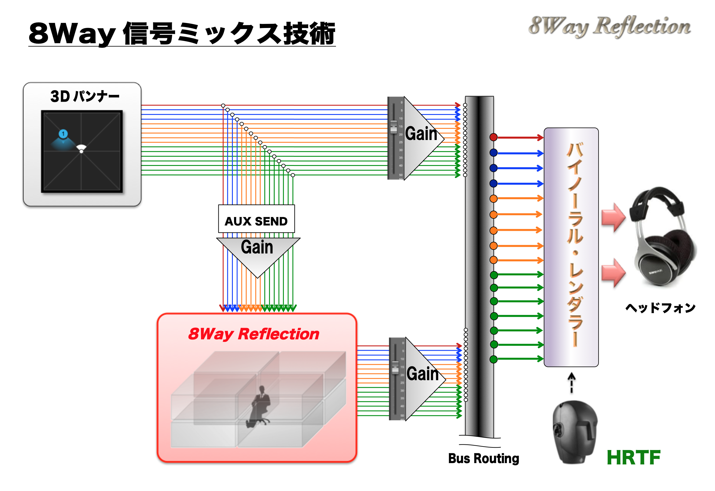 3D Sound のページで解説した通り、8Way Reflection を使うことで、頭の中で鳴っていた音源は頭の外側に定位(頭外定位)するようになり、ヘッドフォンから音が鳴っているのではなく、実際に ”すぐそこで話している” ような感覚で聴こえてきます。