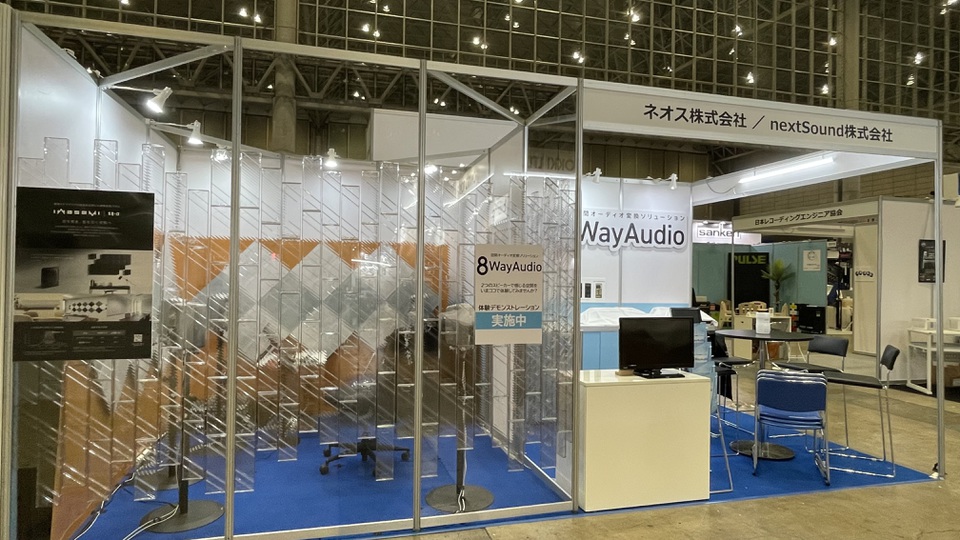 ご覧のような簡易な仕切りしかない展示会という独特の場所で、しかも騒音が大きい環境でどこまで正確な立体音響体験を提供できるか未知数でしたが、