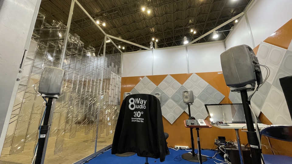ご覧のような簡易な仕切りしかない展示会という独特の場所で、しかも騒音が大きい環境でどこまで正確な立体音響体験を提供できるか未知数でしたが、